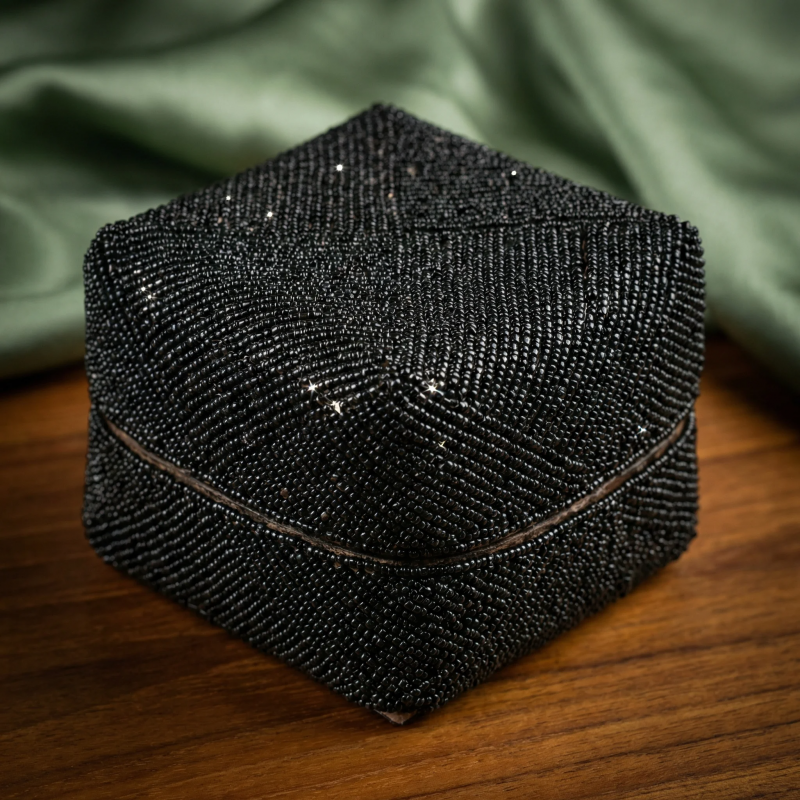 This Black Crystal Beaded Decorative Jewelry Box combines elegant design with practical storage. The exterior is meticulously adorned with shimmering black beads and crystals, forming a textured, tactile surface that glistens under light. Ideal for storing keepsakes, rings, or small personal treasures, this box features a compact and stylish hexagonal shape, making it a striking addition to vanity tables or display shelves. The sturdy base and hinged lid promise durability while maintaining a luxurious appearance, perfect for organizing favorite jewelry or gifting as a sophisticated accent piece for any décor style.