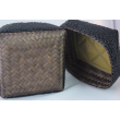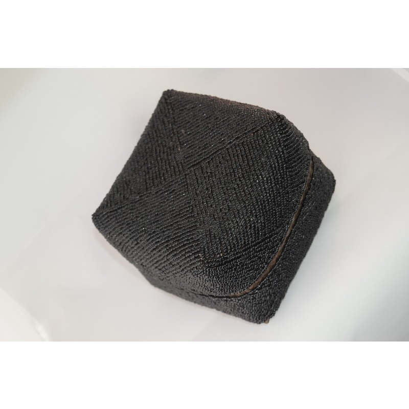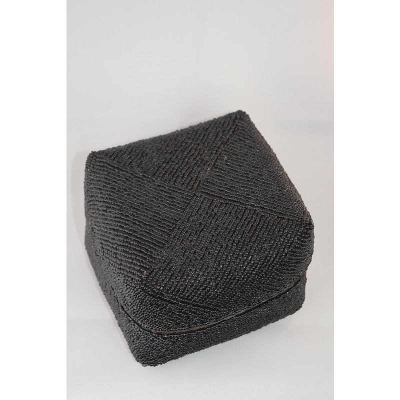 A compact trinket box adorned with tiny black beads in a geometric pattern. Ideal for storing small treasures or as a decorative piece.