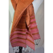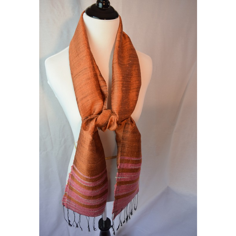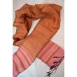 A richly textured silk scarf in burnt orange with striking pink and white striped ends, finished with black fringe tassels. A bold and luxurious accessory.