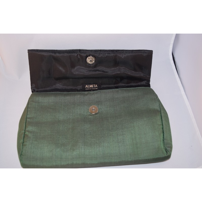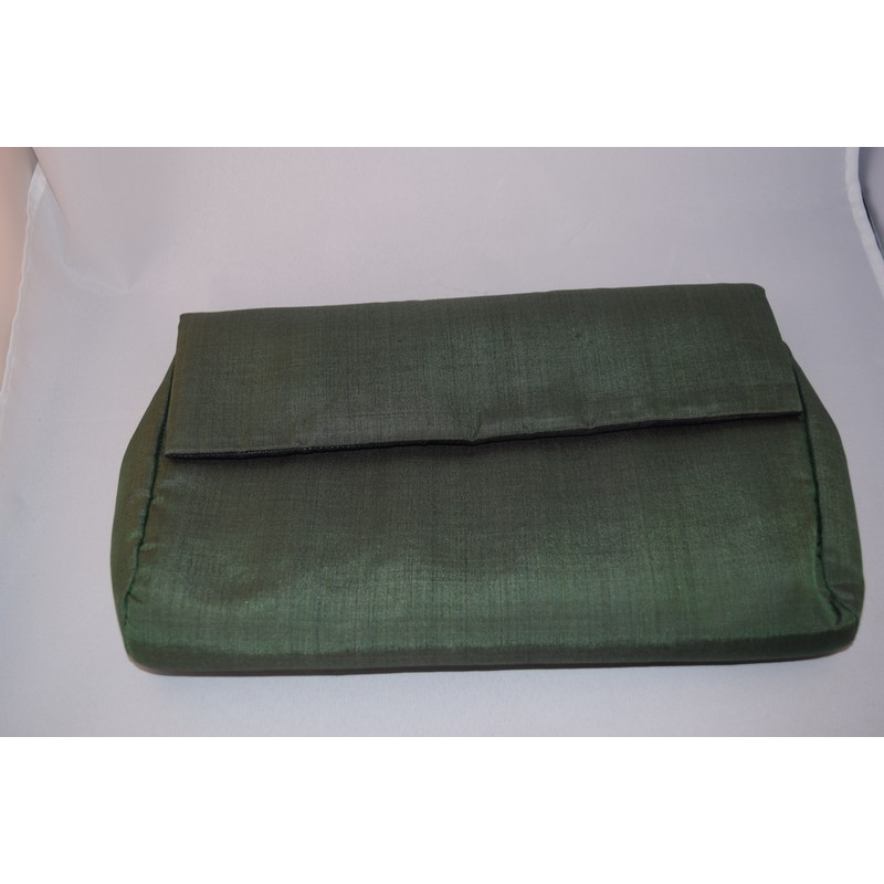 A sophisticated silk clutch in a deep olive green hue, featuring a structured form and subtle sheen. Ideal for evening events or as an understated accessory for formal wear.
