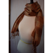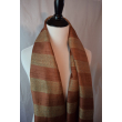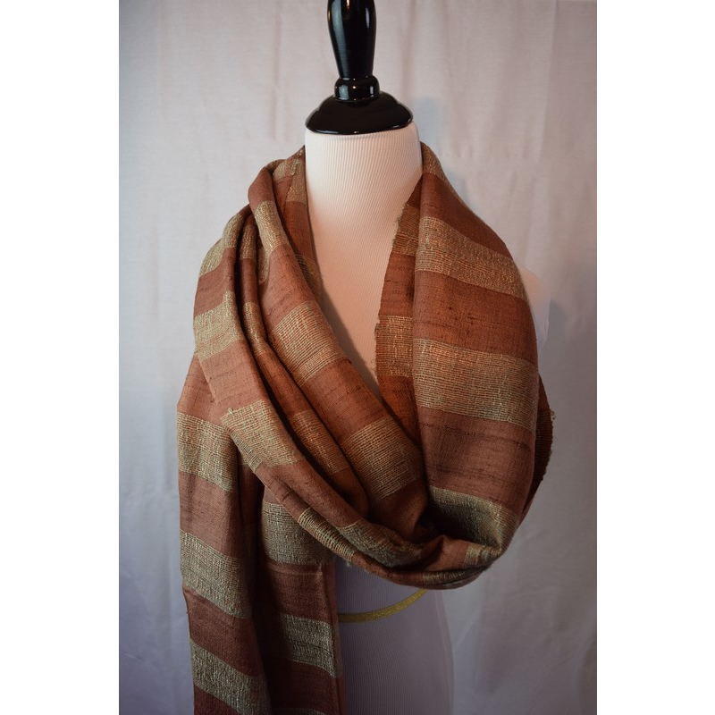 Handwoven silk scarf in warm brown tones with subtle golden stripes. Its rustic elegance and soft texture make it a versatile accessory for all seasons.