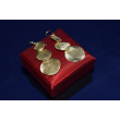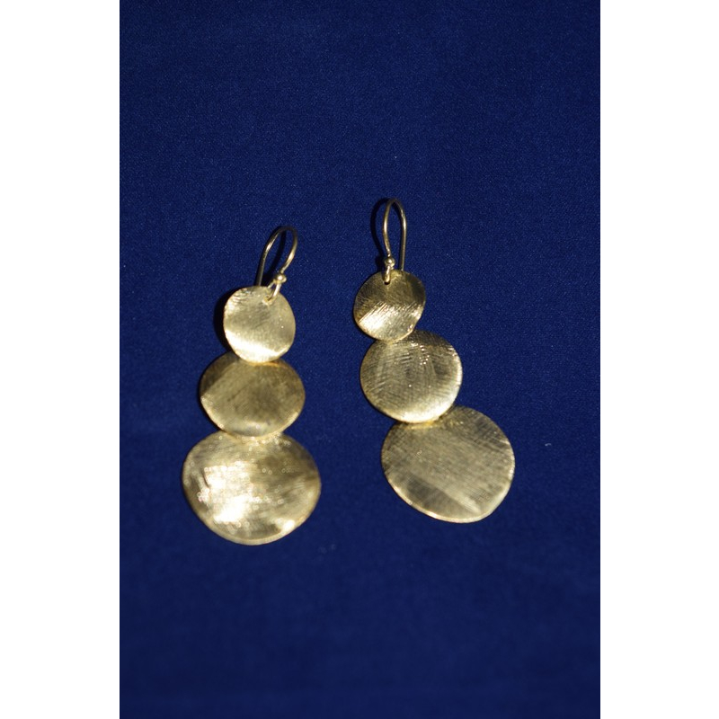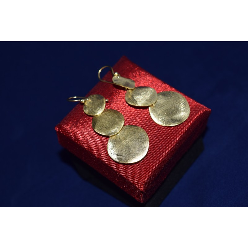 A dramatic pair of gold-toned earrings with cascading, brushed metal discs in graduating sizes. Elegant and bold, ideal for evening wear.