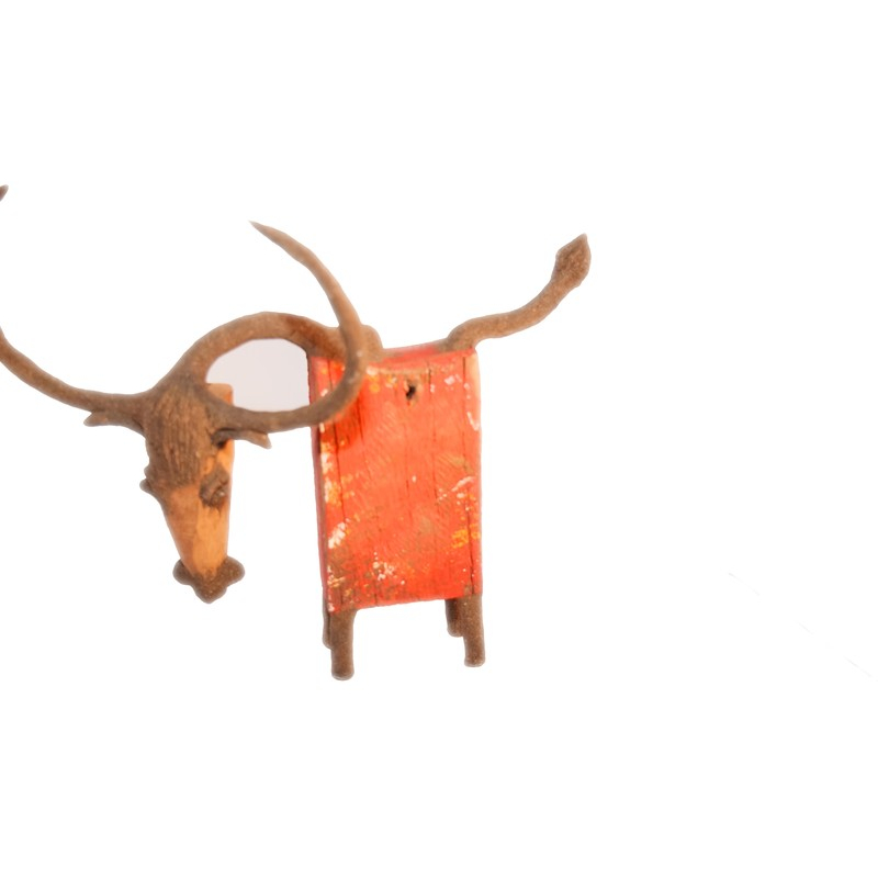 Rustic charm meets artisan craftsmanship in this wooden bull sculpture, complete with twisted horns and a distressed red-painted body. A decorative collectible.