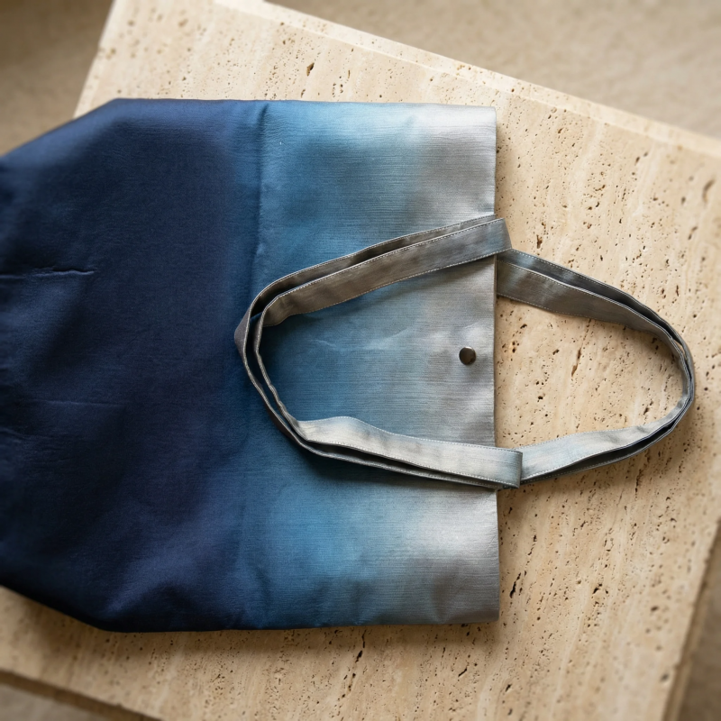 This hand-dyed tote bag is crafted from luxurious silk and features an elegant ombre gradient shifting from deep navy to soft gray-blue. The unique coloration and smooth texture provide both a refined look and a pleasant tactile experience. Designed with reinforced handles for increased durability, this spacious bag easily carries daily essentials, making it suitable for errands, casual outings, or as an accent accessory. The silk fabric lends a lightweight yet sophisticated vibe, while the subtle color transitions make each bag distinctly one-of-a-kind. Ideal for those who appreciate both artistry and practicality in their fashion accessories.