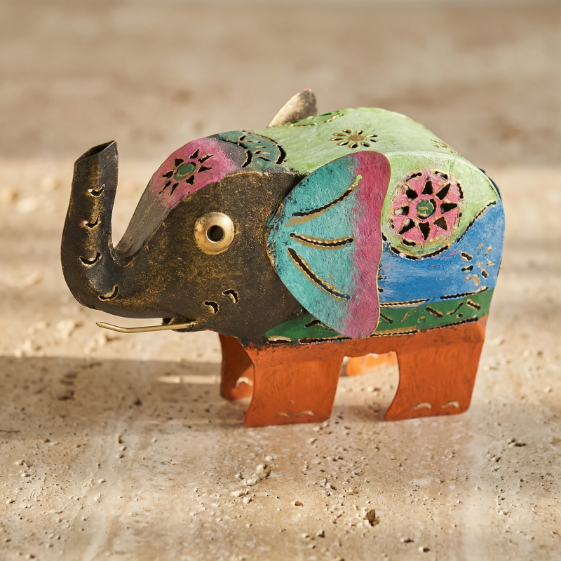 This hand-painted elephant candle holder features intricate detailing in a vibrant palette of green, blue, pink, and orange hues. Crafted from durable material, the design embodies traditional artistry with floral accents on the ears and a refined finish that brings character to any tabletop. The sturdy legs allow secure display while supporting a standard tealight or small votive candle. Perfect for adding an artistic touch to home decor, this piece showcases a charming elephant motif, ideal for cultural or bohemian-themed spaces. The compact size ensures it fits well on shelves, mantels, coffee tables, or as a striking centerpiece, combining both function and decorative appeal.