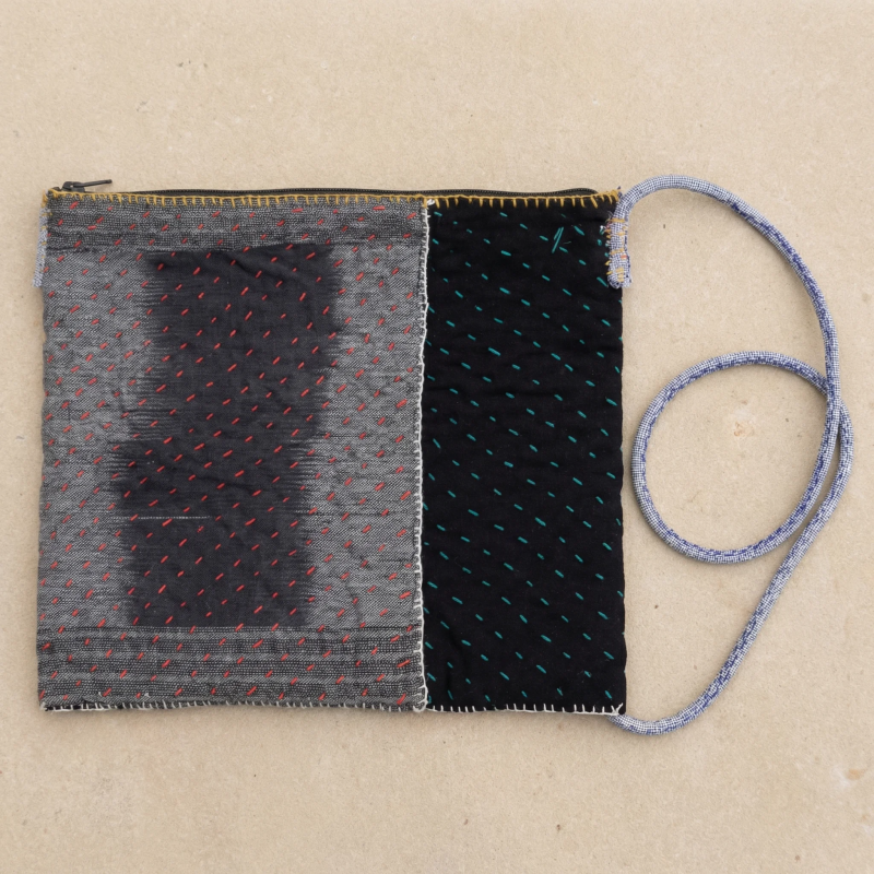 This handmade patchwork crossbody pouch features a unique dual-fabric design, with textured grey cloth on one side and black fabric dotted with colored accents on the other. The pouch is equipped with a simple closure to keep your essentials secure and an attached thin cord strap for comfortable crossbody carrying. Its flat, compact profile makes it perfect for daily use or casual outings, offering a practical solution for carrying small items such as phones, cards, or cosmetics. The craftsmanship highlights minimalist, functional design with a dash of artisanal character, making it suitable for anyone seeking style and convenience in one piece.