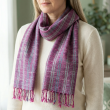 This handwoven scarf boasts a classic plaid pattern in rich plum and orchid tones, accented with subtle turquoise lines. Crafted with meticulous attention to detail, the scarf features soft draping and comfortable warmth, making it suitable for both daily wear and layering in cooler weather. The neatly finished ends are adorned with playful fringe in a complementary shade, adding texture and visual interest. This versatile fashion accessory is designed to be both functional and stylish, pairing seamlessly with casual or dressy outfits. Its generous length allows for multiple styling options, from snug wraps to elegant draping, ideal for adding a pop of color and pattern to your autumn or winter wardrobe.