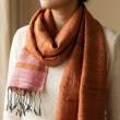This handwoven scarf features a rich rust orange body contrasted by a section of rose pink with subtle golden stripes and dark knotted fringe. Made from soft, textured fibers, it provides both warmth and refined style for cold weather. The unique color-blocking design offers versatility—drape it loosely over a sweater for casual layering or wrap tightly for added coziness on windy days. The tactile weave and artisanal craftsmanship make this scarf a standout choice for those who appreciate natural tones and handmade accessories, suitable for both everyday wear and special seasonal looks.