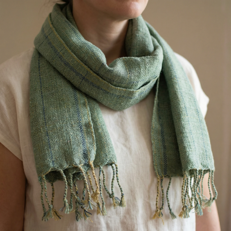 This handwoven sage green wool scarf features a soft, textured weave and subtle yellow and blue accent stripes. Finished with twisted fringe at the ends, the scarf offers both warmth and style for cooler weather. The lightweight wool construction makes it versatile for indoor or outdoor wear, and the neutral yet distinctive green tone pairs easily with a variety of outfits. Its artisanal craftsmanship is visible in the meticulously woven fabric and detailed finishing, making it a wonderful accessory for those who appreciate quality and understated design.