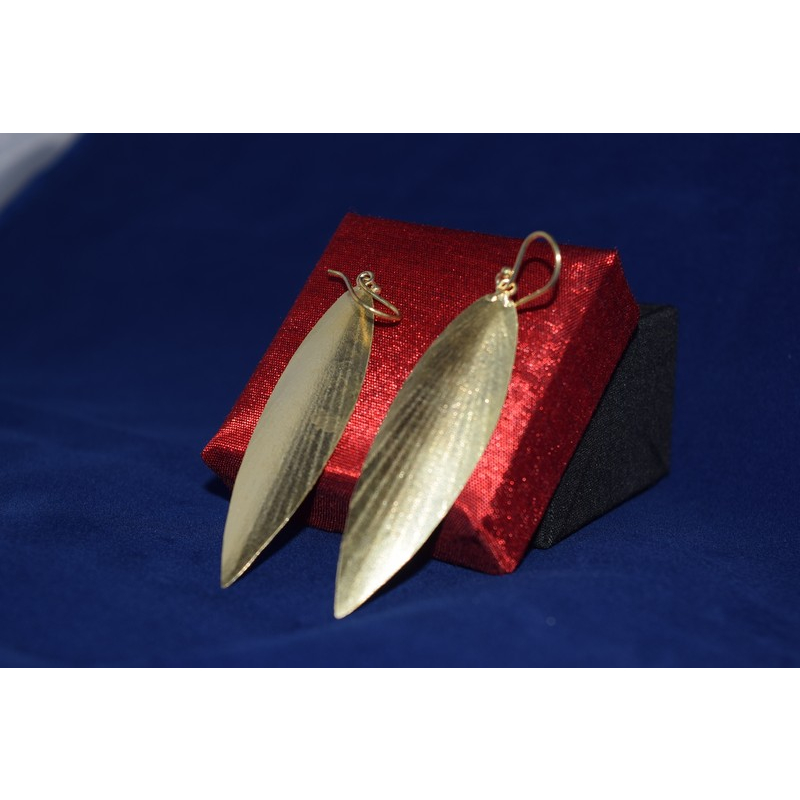 Elegant brass earrings shaped like elongated leaves with a fine etched texture. Their organic form and slender profile offer a nature-inspired, contemporary style.