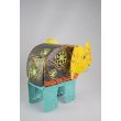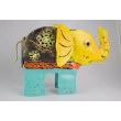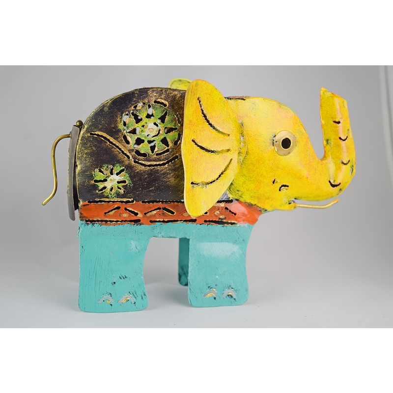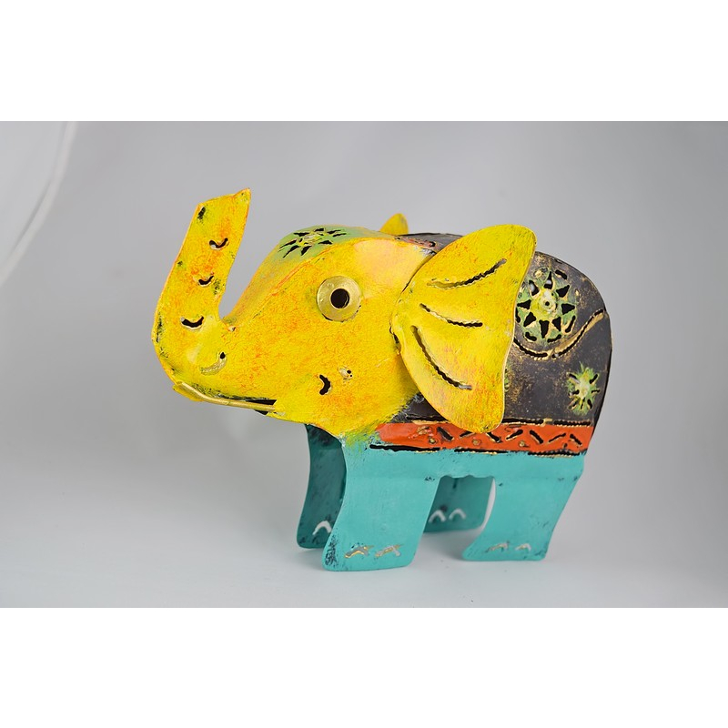A vibrantly painted metal elephant with intricate floral cut-outs and colorful detailing. A whimsical, handcrafted accent for eclectic decor.