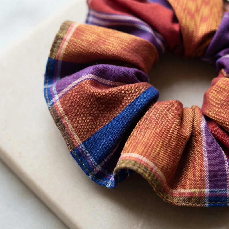 The Plaid Sunset Scrunchie offers a stylish twist for securing hair, crafted from soft, vibrant multicolor plaid fabric. Featuring shades of purple, blue, red, and orange, this hair accessory stands out for its vivid contrast and artisan quality. The scrunchie is designed to gently hold hair without pulling or snagging, making it ideal for thick or fine hair alike. Its versatile palette complements both casual and dressed-up looks. Perfect for daily use or adding a pop of color to your ensemble, this scrunchie combines durability and fashion-conscious design for effortless all-day wear.