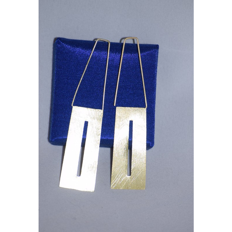 These elongated brass earrings feature a modern, geometric design with slim rectangular cut-outs. Lightweight yet striking, they lend a contemporary edge to everyday and evening styles alike.