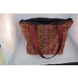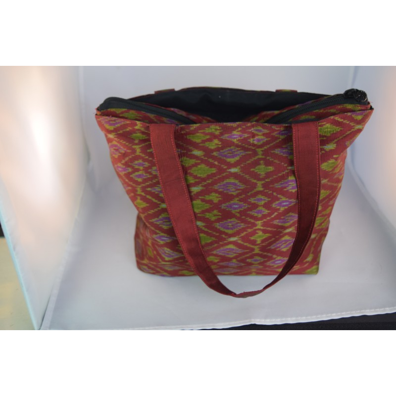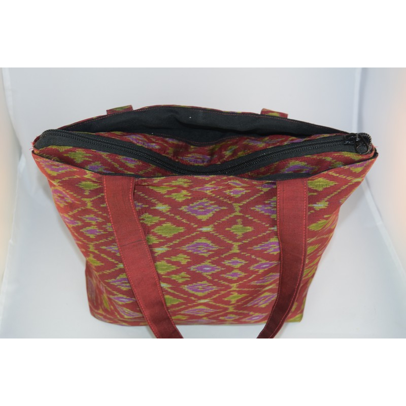 A bold and stylish tote bag featuring a traditional red ikat pattern with accents of green and violet. Fully lined with a secure black zipper closure and sturdy matching handles. Ideal for daily errands or as a standout accessory.