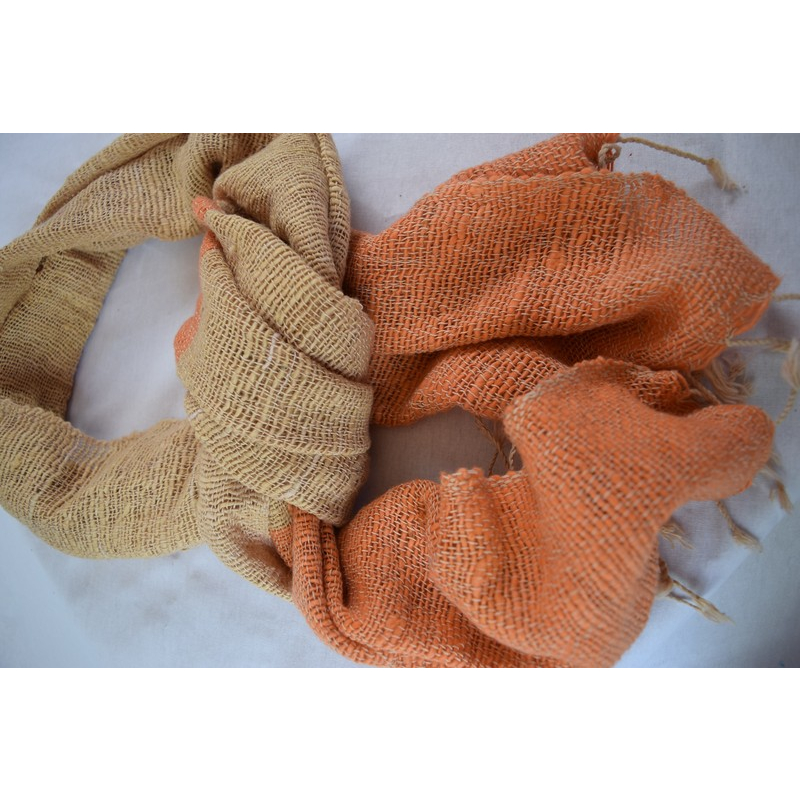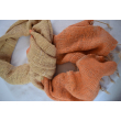 Handcrafted scarf featuring a blend of earthy orange and sandy beige hues in a loosely woven texture. This cozy wrap brings a touch of rustic charm to cool-weather styling.