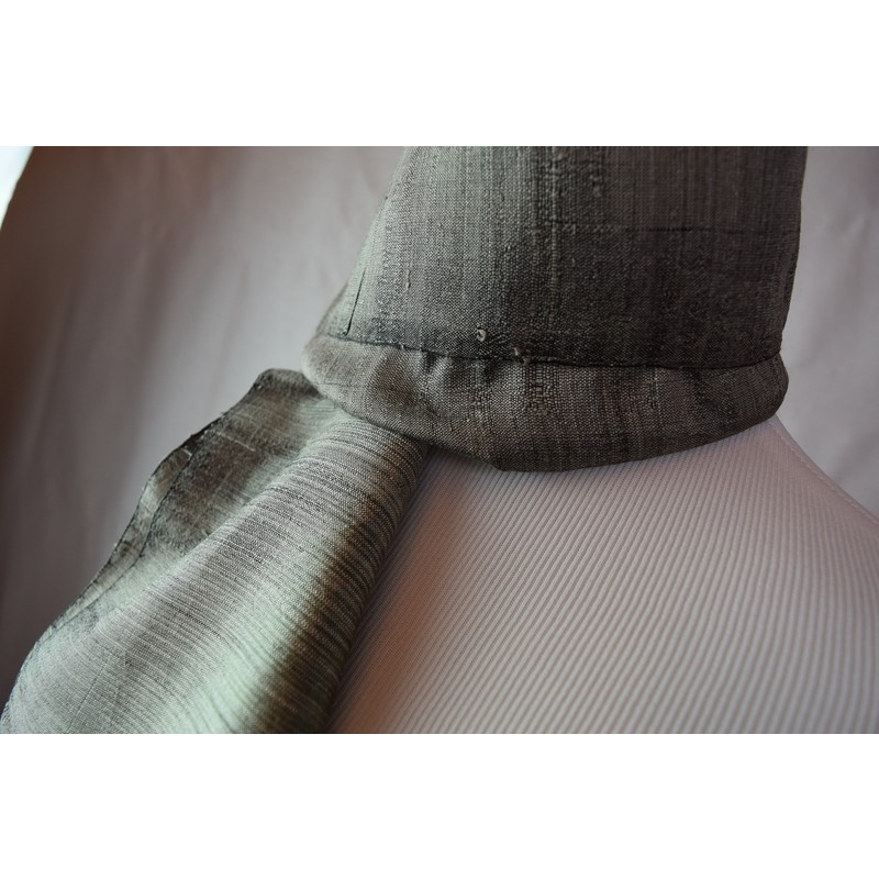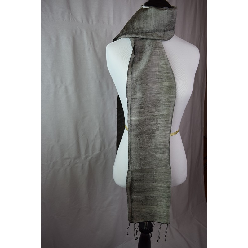 A close-up view of the same handloom silk scarf reveals its luxurious texture and fine weave. The muted grey tones and natural sheen highlight the quality of its artisanal craftsmanship.
