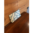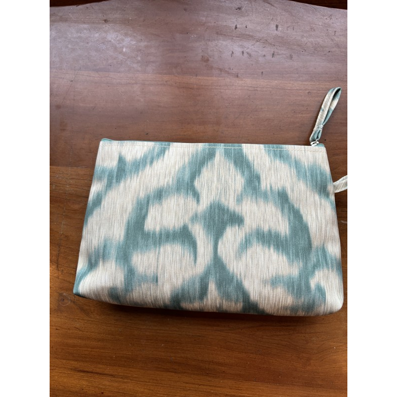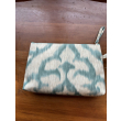 A compact and elegant zippered pouch in teal and cream ikat fabric. Ideal for use as a makeup bag, clutch, or organizer. Features a slim wrist strap for convenience.