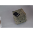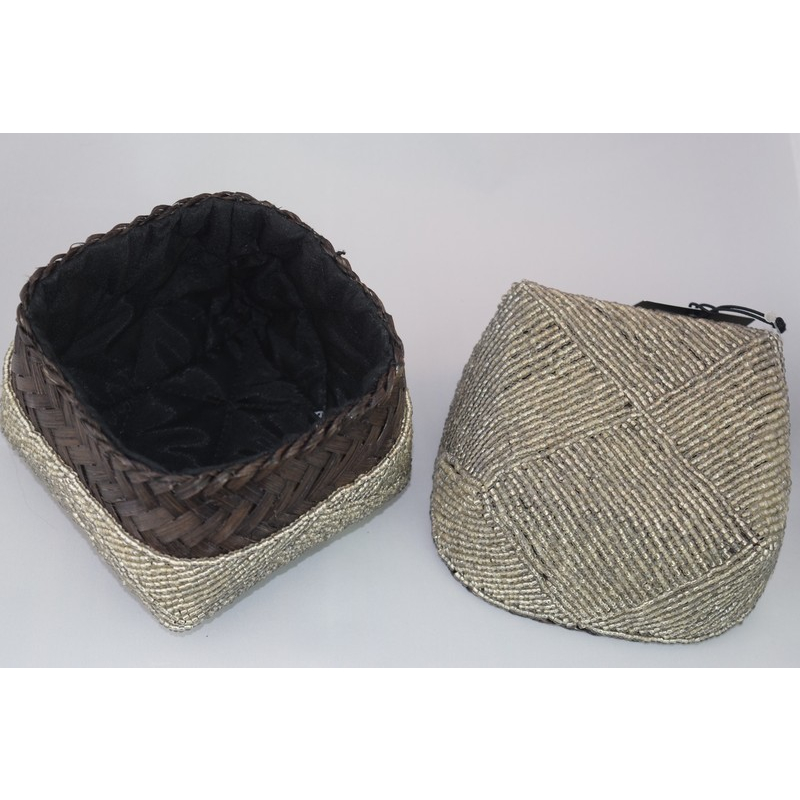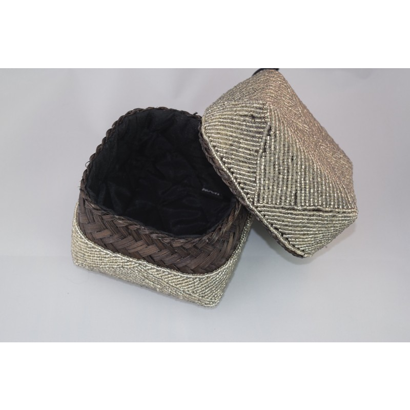 Square keepsake box crafted with dark brown woven base and a beaded lid in shimmering White Gold patterns. A stylish and functional storage accent.