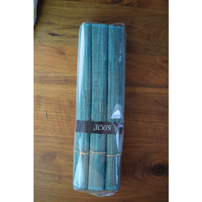 Add a fresh pop of color to your table with this set of aqua-hued woven mats, designed for both style and practicality.