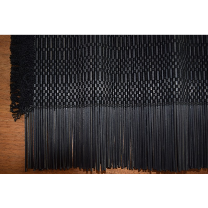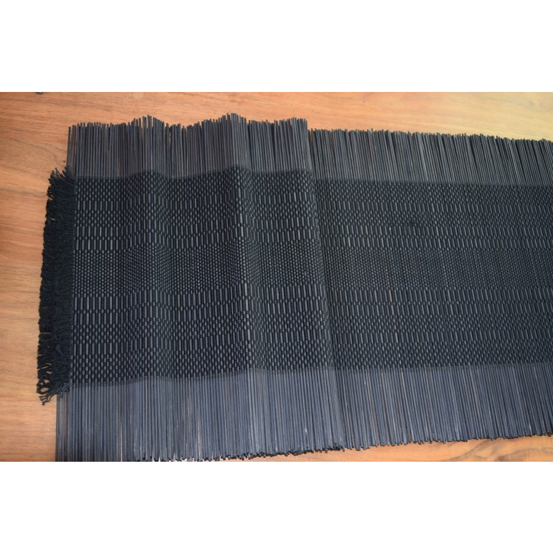 A striking black table runner woven with a checkerboard pattern and finished with fine bamboo fringe. Adds texture and modern flair to any surface.