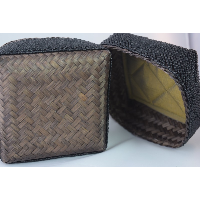 A compact trinket box adorned with tiny black beads in a geometric pattern. Ideal for storing small treasures or as a decorative piece.