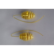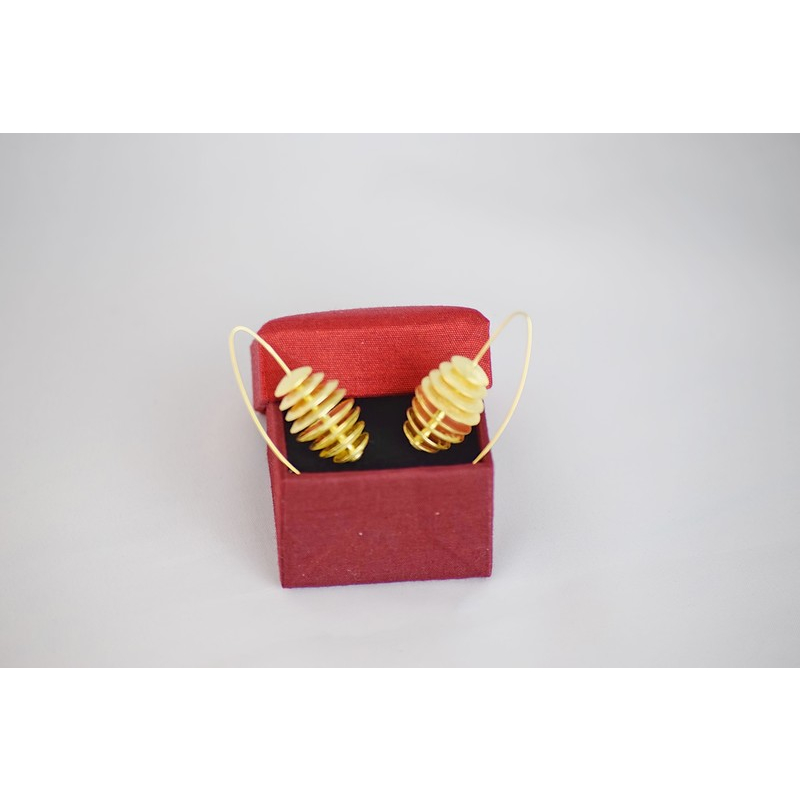 These contemporary earrings are composed of stacked, graduated brass discs forming a sculptural coil shape. Suspended from elegant arc-shaped hooks, they make a bold geometric statement with a golden glow.
