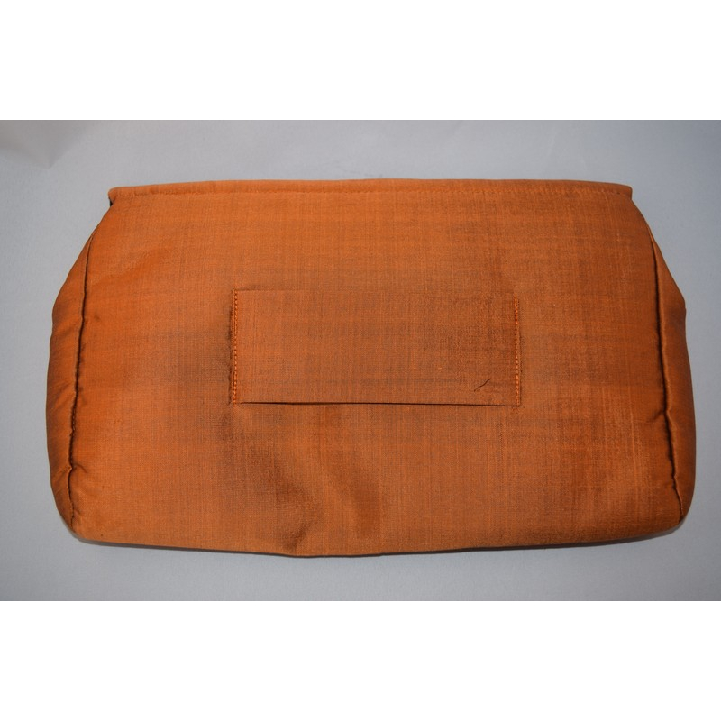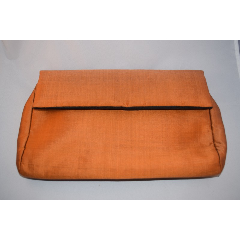 This elegant clutch in a warm burnt orange shade is crafted from lustrous silk. Its minimalist flap design makes it a perfect companion for both formal and festive occasions.