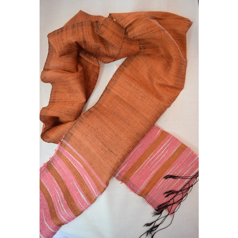 A richly textured silk scarf in burnt orange with striking pink and white striped ends, finished with black fringe tassels. A bold and luxurious accessory.