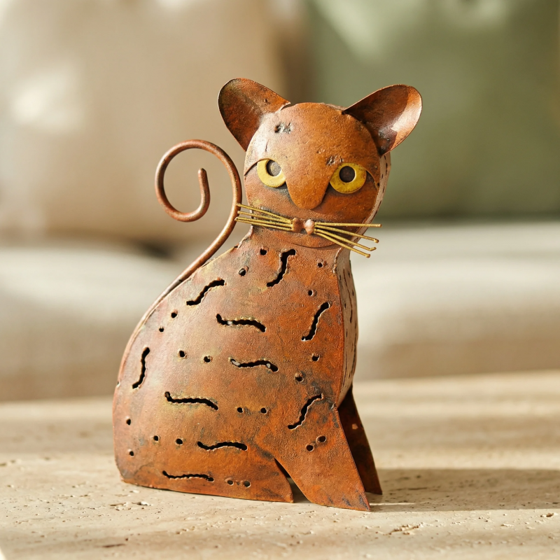 This cat-shaped candle holder is crafted from durable metal, finished in a warm copper hue with charming hand-painted details. The holder is designed to securely accommodate a standard tealight or small votive candle, allowing the light to shine through playful cut-out patterns, creating an enchanting glow. With its curled tail and lifelike feline features, this piece is both functional and decorative, making it a standout accent for coffee tables, mantels, or window sills. The holder’s sturdy construction and artistic design make it ideal for cat lovers, collectors, or anyone looking to infuse their living space with a touch of cozy, artistic charm.