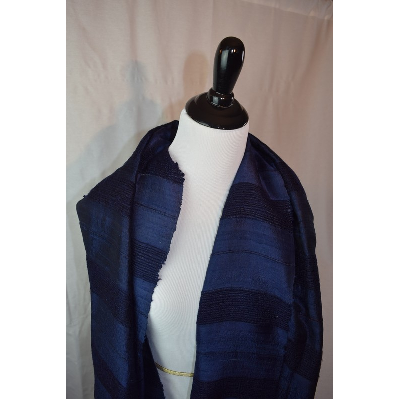 Crafted from lustrous silk, this richly textured scarf features horizontal striping in shades of deep indigo. The subtle sheen and tonal weave make it a refined accessory for both formal and everyday wear.