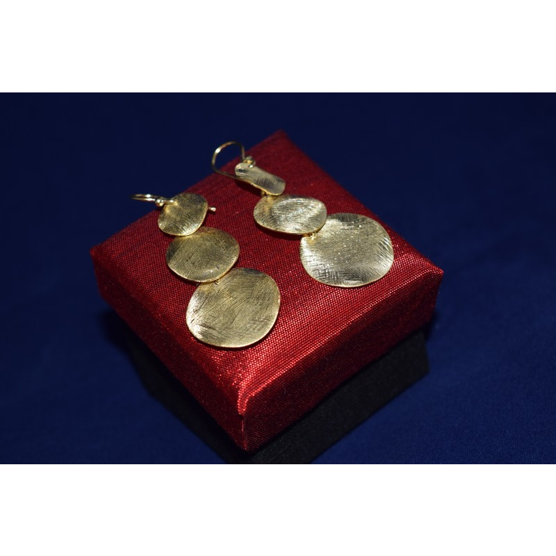 A dramatic pair of gold-toned earrings with cascading, brushed metal discs in graduating sizes. Elegant and bold, ideal for evening wear.