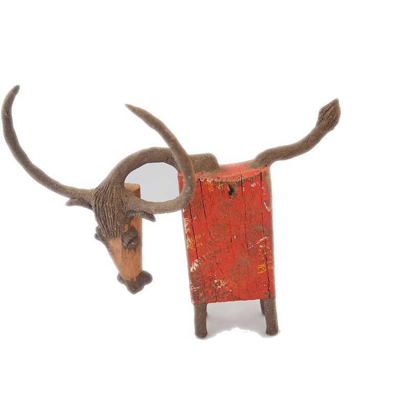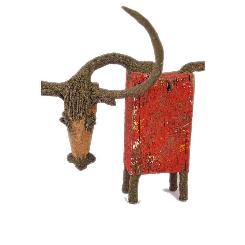 Rustic charm meets artisan craftsmanship in this wooden bull sculpture, complete with twisted horns and a distressed red-painted body. A decorative collectible.