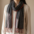 This handwoven scarf features a rich charcoal gray color, accented by elegant red trim along the edges for a refined touch. The lightweight, textured weave offers breathability and comfort, making it suitable for year-round wear. Detailed with artisan-crafted fringed ends, this scarf complements both casual and professional outfits, adding warmth and style. The understated palette and distinctive hand-finished edge make it a versatile accessory, ideal for layering over shirts, sweaters, or jackets. Its generous length allows for various styling options, including draping, knotting, or wrapping, ensuring ease of wear and adaptability in different settings.