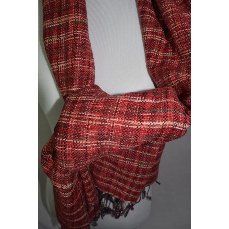 Add a rustic charm to your table setting with this handwoven table runner in rich red plaid. Its textured weave and subtle fringe make it perfect for casual and festive dining alike.