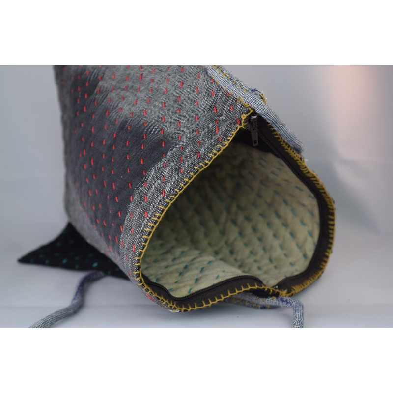 A unique sling pouch crafted with three textile panels—charcoal grey, deep black, and faded indigo—each accented with traditional kantha-style hand stitching in red, blue, and yellow thread. Features a top zipper closure and a soft cord strap. A functional yet artisanal accessory ideal for carrying essentials.