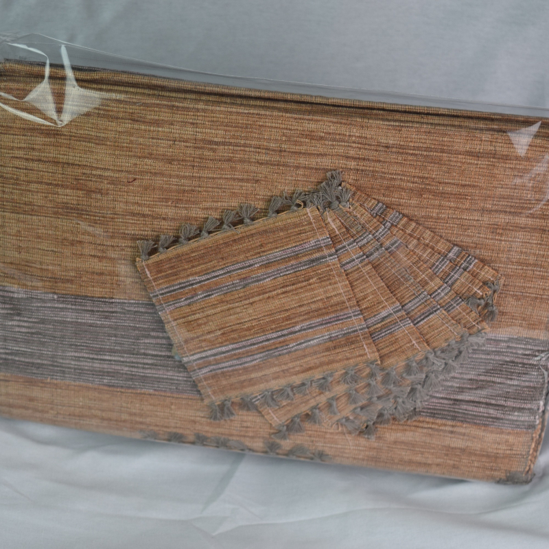 This elegant set includes a woven table runner, four matching placemats, and four coasters, designed to complement a modern or rustic dining space. Crafted from durable, eco-friendly fibers, the set features a warm, earthy palette with subtle stripe detail and tassel accents at the ends of the runner and placemats. The coordinated pieces protect your table from heat, stains, and scratches, elevating everyday meals or gatherings with understated sophistication. Easy to maintain and functional, this set is ideal for casual family dining or special occasions, making your table setting both practical and visually appealing.