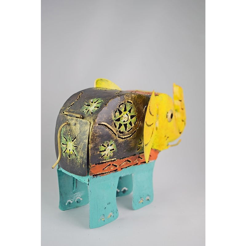 A vibrantly painted metal elephant with intricate floral cut-outs and colorful detailing. A whimsical, handcrafted accent for eclectic decor.