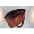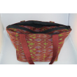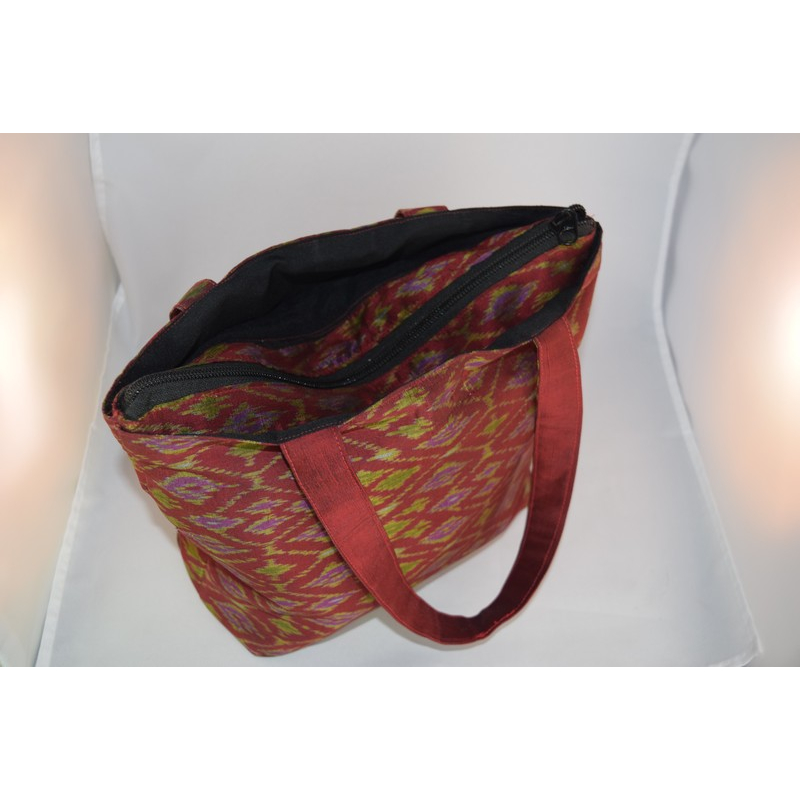 A bold and stylish tote bag featuring a traditional red ikat pattern with accents of green and violet. Fully lined with a secure black zipper closure and sturdy matching handles. Ideal for daily errands or as a standout accessory.