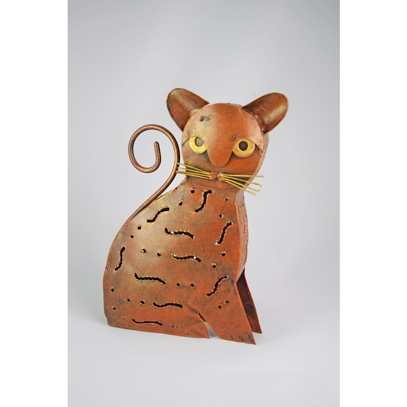 A handcrafted cat sculpture in rustic-finish metal, featuring cut-out patterns and golden facial accents. Perfect for adding a quirky, artisanal charm to any space.