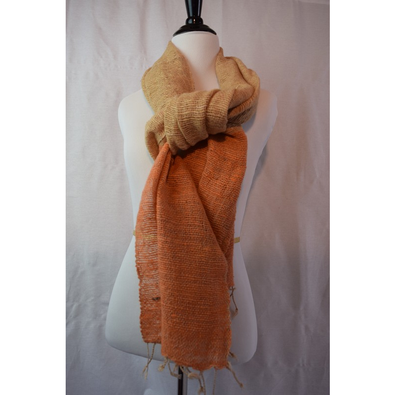 Handcrafted scarf featuring a blend of earthy orange and sandy beige hues in a loosely woven texture. This cozy wrap brings a touch of rustic charm to cool-weather styling.