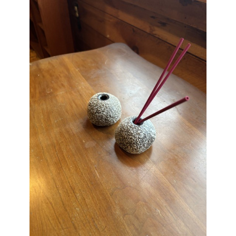 These two petite ceramic vases feature an organic, stone-like surface with a speckled white and brown matte finish that mimics natural textures. Rounded and compact, each vase measures 2 1/8 inches tall and 2.5 inches in diameter, making them perfect for small floral stems, dried botanicals, or use as incense holders—as shown in the image. Their narrow openings and minimalist form highlight a modern wabi-sabi aesthetic, embracing natural imperfection and texture. Whether displayed individually or as a pair, these vases bring a calming, earthy presence to shelves, desktops, or zen-inspired spaces.