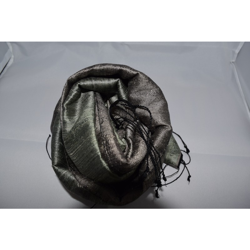 A close-up view of the same handloom silk scarf reveals its luxurious texture and fine weave. The muted grey tones and natural sheen highlight the quality of its artisanal craftsmanship.