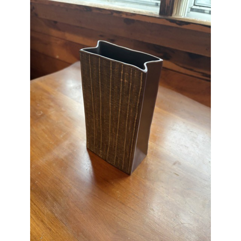 This unique ceramic vase mimics the form and texture of a crumpled paper bag, complete with vertical "striped" creases and soft folded edges. Finished in a matte brown glaze, it evokes the natural tone of kraft paper while offering the durability and sculptural quality of ceramic. At 7 3/4 inches tall, this vase is perfect for narrow floral arrangements, dried stems, or as a stand-alone decorative piece. Its playful trompe-l’oeil design gives it an artistic edge, making it a conversation piece for shelves, desks, or dining settings with a modern rustic or minimalist flair.