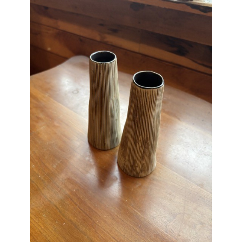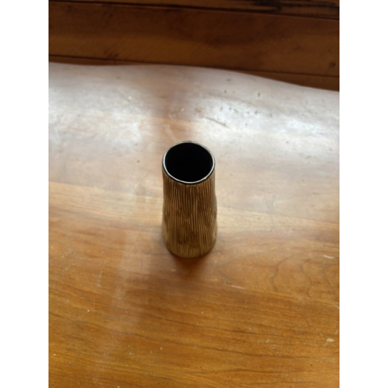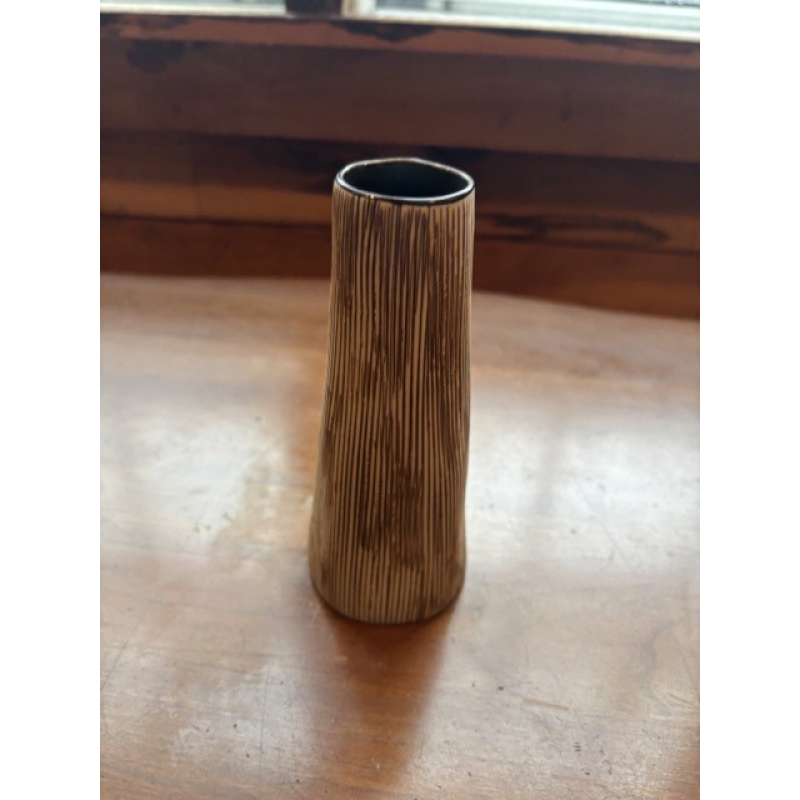 This slender, cylindrical flower vase is crafted from ceramic and features a matte finish with fine vertical striations in brown over a white base, evoking the look of hand-carved wood grain. The shape subtly tapers outward toward the base, lending it a modern, minimalist silhouette. Standing 5 inches tall and 3 inches in diameter, this vase is ideal for single stems or minimalist floral arrangements. Its tactile texture and natural tones make it a versatile decorative piece for shelves, mantels, or tabletop settings with organic or Scandinavian decor themes.