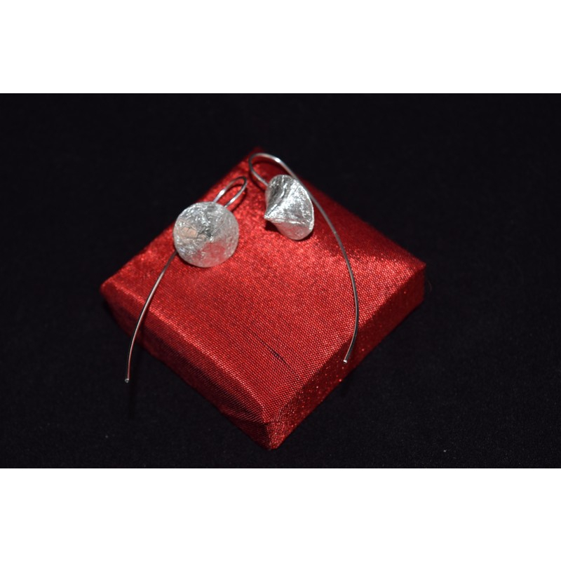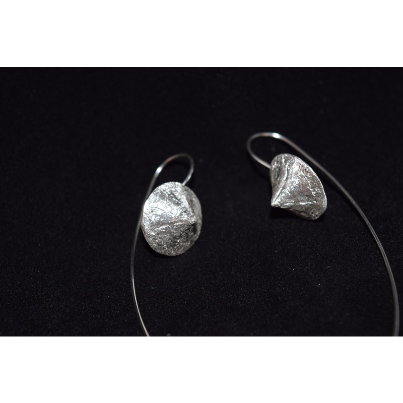 Modern with an artistic twist, these drop earrings showcase a crinkled, pod-like White Gold form suspended on a fine arched wire. Each earring is uniquely textured, offering a subtle glint and sculptural charm for minimalist styling.
