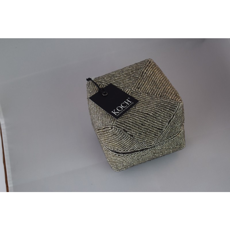 Square keepsake box crafted with dark brown woven base and a beaded lid in shimmering White Gold patterns. A stylish and functional storage accent.